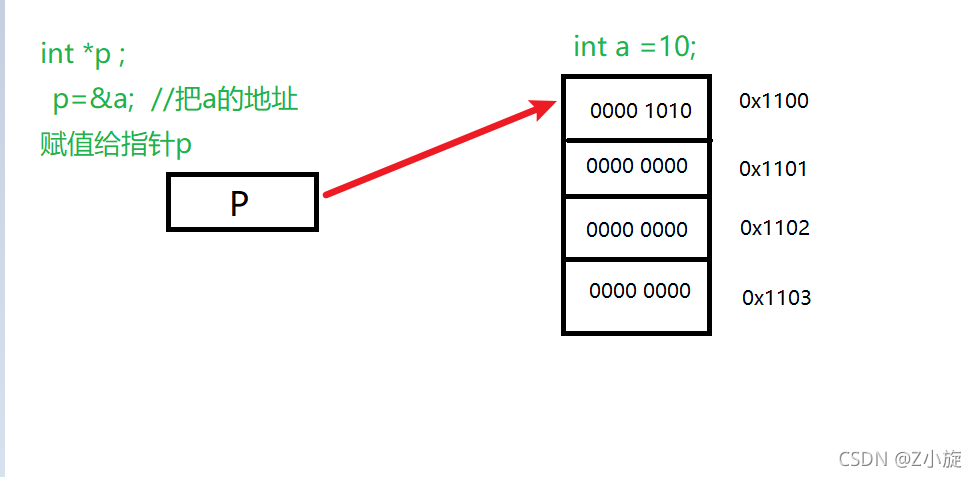 int a =10; int*p; p=&a; //把a的首地址赋值给P