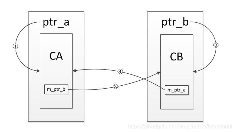 通过结果可以看到,最后CA和CB的对象并没有被析构,其中的引用效果如下图所示,起初定义完ptr_a和ptr_b时,只有①③两条引用,然后调用函数set_ptr后又增加了②④两条引用,当test_refer_to_each_other这个函数返回时,对象ptr_a和ptr_b被销毁,也就是①③两条引用会被断开,但是②④两条引用依然存在,每一个的引用计数都不为0,结果就导致其指向的内部对象无法析构,造成内存泄漏。