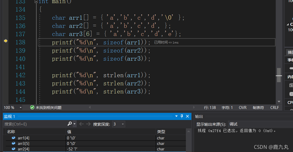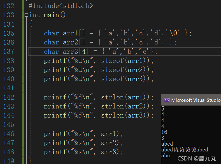 相信大家都知道,字符串是以' '字符为结束标志的,这个标志本身也占用一个内存,我们在输出的时候是看不到这个字符的,这是由编译器所决定的,因为编译器的符本身占用了一个字节,所以sizeof()这个关键字在计算数组所占内存时要比字符多一个,如图中的arr1和arr2,而在计算arr3时,结果只有5,但输出和图二中我们所看到的却不止5个字符,那么这是为什么呢?