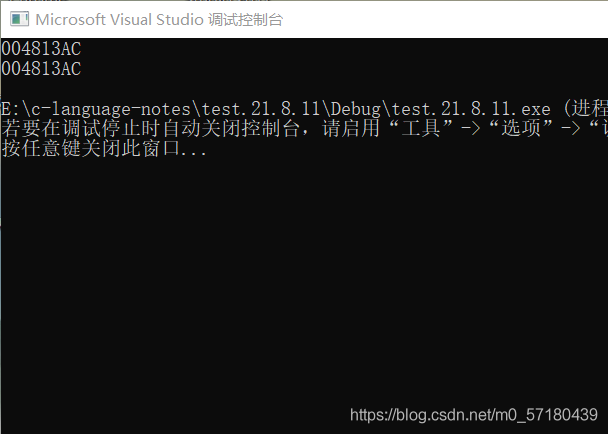 由以上三个例子,我们能总结指针的共同点:存放某个类型变量的地址,指向那个类型的变量,但是在讲函数指针首先有一个问题:函数也有地址吗?我们用一段简单的代码来验证一下即可。