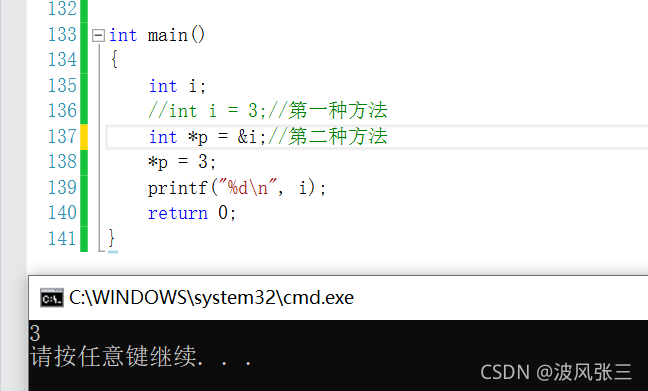 第二种方法,把3送到变量p所指向的单元(即变量i的存储单元,也就是地址,如p=3,其中i表示p指向的对象)
