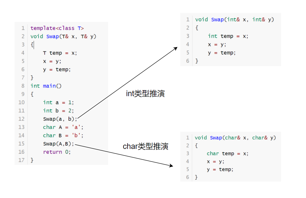 在编译器编译阶段,对于模板函数的使用,编译器需要根据传入的实参类型来推演生成对应类型的函数以供调用。比如:当用int类型使用函数模板时,编译器通过对实参类型的推演,将T确定为int类型,然