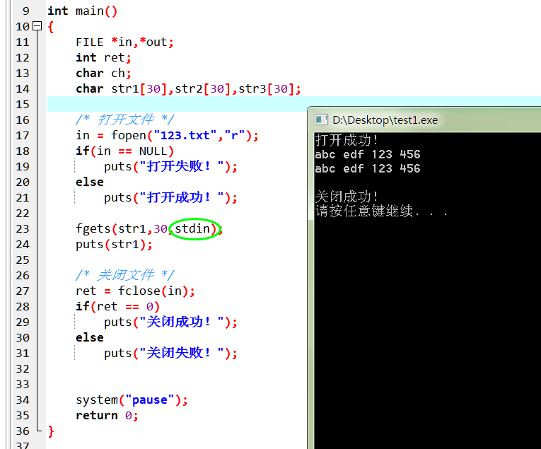 将读取的字符数量修改为30,就会打印出123.txt文件中全部内容。如果修改fgets()第三个参数为stdin,那么fgets()函数就可以通过键盘读取字符串。
