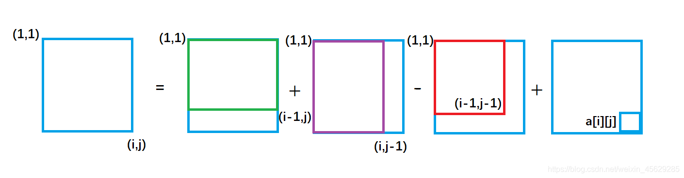 紫色面积是指(1,1)左上角到(i,j-1)右下角的矩形面积, 绿色面积是指(1,1)左上角到(i-1, j )右下角的矩形面积。每一个颜色的矩形面积都代表了它所包围元素的和。