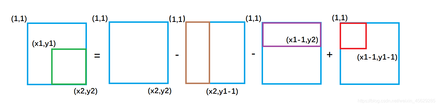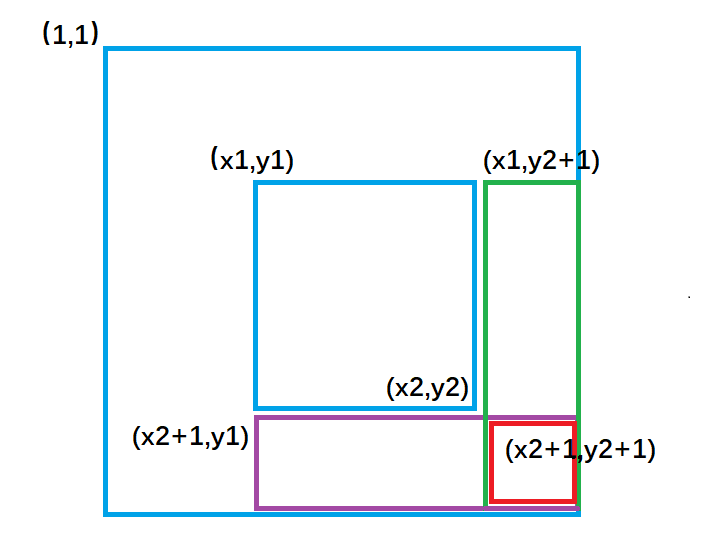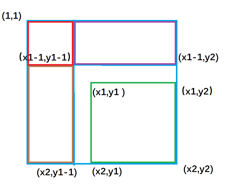 绿色矩形的面积 = 整个外围面积s[x2, y2] - 黄色面积s[x2, y1 - 1] - 紫色面积s[x1 - 1, y2] + 重复减去的红色面积 s[x1 - 1, y1 - 1]