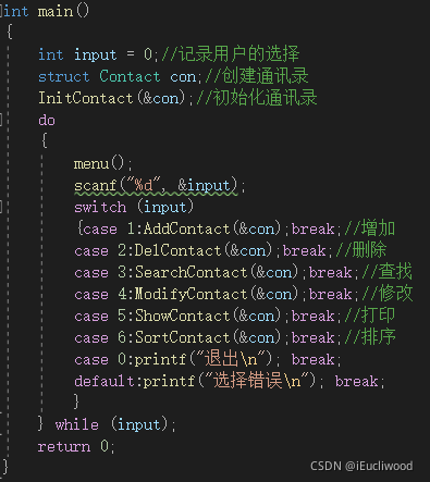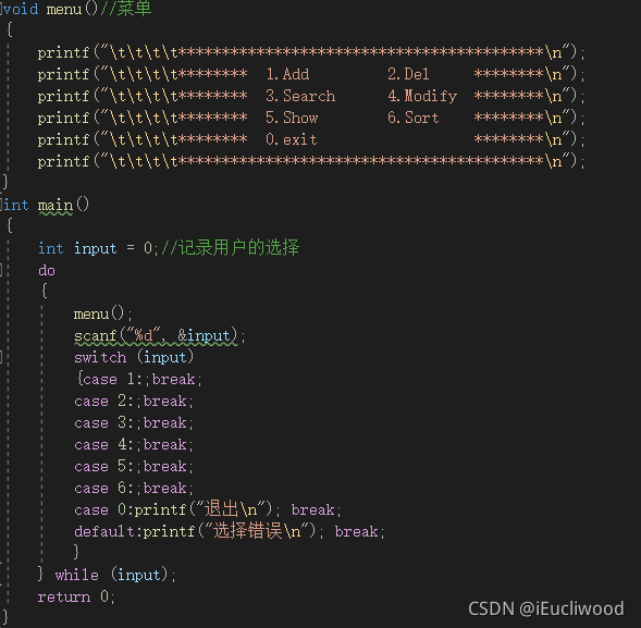 首先就是构架代码基本框架,在主函数中实现打印菜单和循环的功能 (这里为了好截图switch里的语句缩进得比较紧凑)