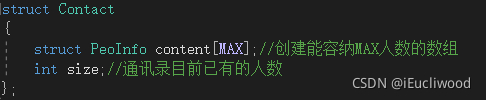 而通讯录里记录的是多人的信息,所以创建通讯录实际上就是创建上述结构体的数组。这里需要思考一个问题,在之后实现函数的功能比如增删时,怎么才能得知从哪里增加或者在什么范围内查找并删除。这就需要用到一个能表达当前通讯录有多少个人的变量。而这个变量也能够用来描述通讯录,与其把他独立定义在主函数里不如创建一个通讯录的结构体,将其定义在里面。这样一来此变量的意义更加明确,也不用每次调用函数时都要额外传递他的参数,只需传结构体就行了。创建通讯录的结构体类型,在Contact.h中定义: