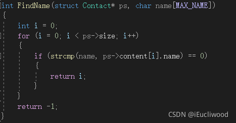 删除函数DelContact(这里封装了一个FindName函数,其功能是找到名字相同的结构体数组元素则返回其下标,未找到则返回-1):