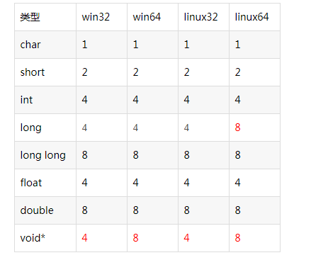长整型long在不用的操作系统中所占用的字节数如下图: