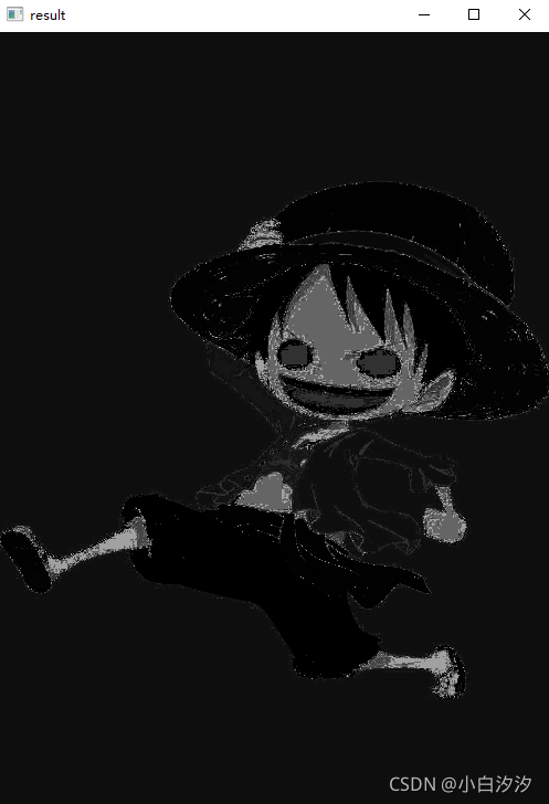 打开第二张图像,并将其转换成HSV色彩空间(代码中对输入的图像做了resize,避免有些图像尺寸过大,显示不全),然后对第一幅图像的直方图做反向投影。下面result是反向投影的结果,目前是框选了路飞的脸部作为感兴趣区域,如果框选路飞的帽子,反向投影会有不一样的效果,大家可以自己尝试。
