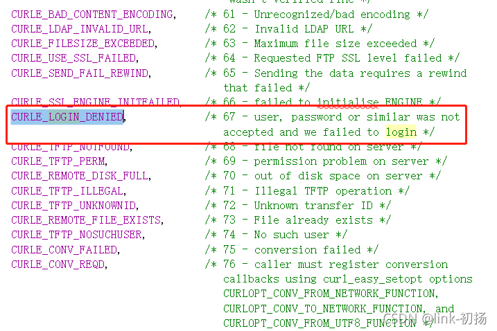 于是通过CURLE_OK go到错误码定义的头文件中,去查看CURLE_LOGIN_DENIED错误码的含义: