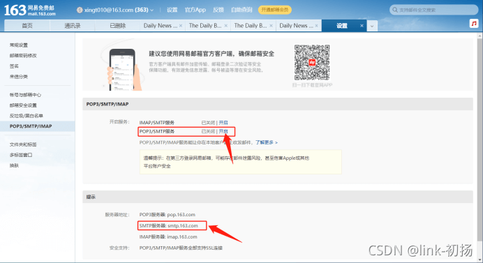 后来想到,是不是要到发送邮件账号中去开启一下smtp服务才可以登陆到163的smtp服务器上?于是到网页上登陆,按下列的操作步骤找到开启当前账号的smtp服务入口:
