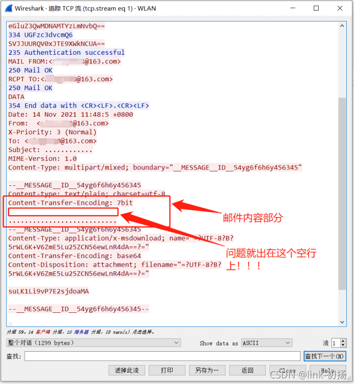 海康的上述界面中发送测试邮件是没问题的,接收到的邮件也是有内容的。于是赶紧抓一下海康发送邮件的数据包,以tcp.port==25过滤了一下,抓出海康发出去的邮件内容: