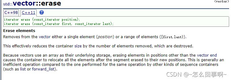 由于向量使用数组作为其底层存储,擦除向量端以外位置的元素会导致容器在段擦除后将所有元素重新定位到其新位置。与其他类型的序列容器对相同操作执行的操作相比,这通常是一种低效的操作(如列表或转发列表)。