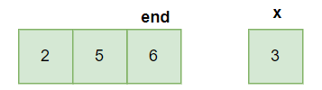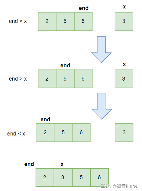 可以发现有两个循环,一个循环时end倒着遍历完之后,使得最开始的end结束的数组加入x后是一个有序数组,最后再返回这个新数组的最后一个元素所在位置