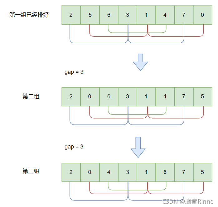 gap个组,所有距离为的记录分在同一组内,并对每一组内的记录进行排序。然后,重复上述分组和排序的工作。当到达gap=1时,所有记录在统一组内排好序。