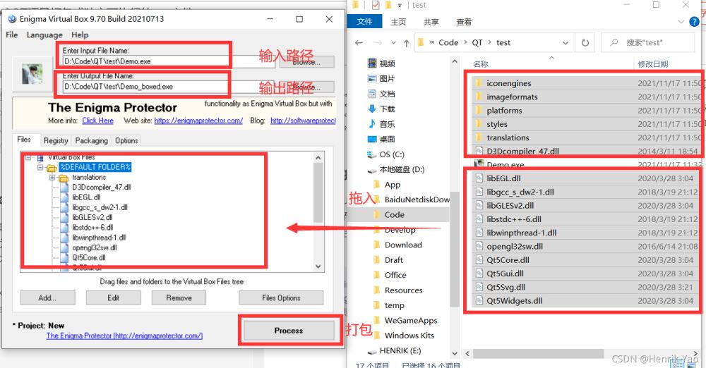 以Demo项目为例,使用Qt creator构建,使用Enigma Virtual Box打包