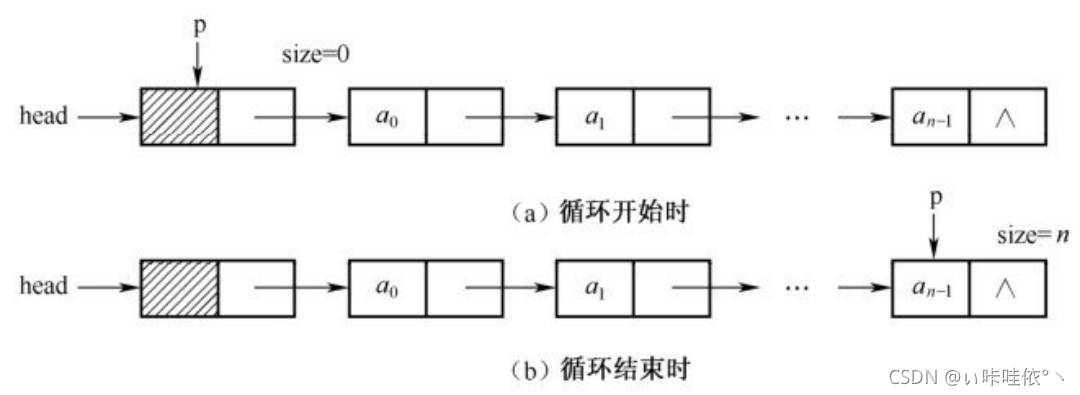 a.设置一个指针变量p指向头结点和计数变量size等于0