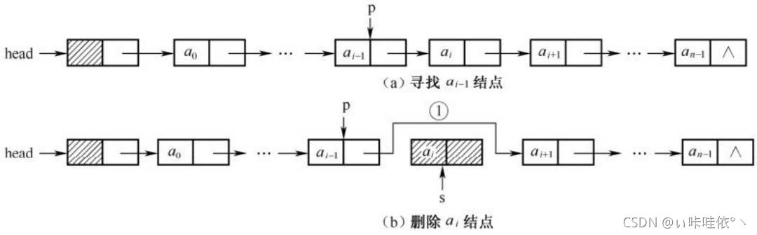 a.设置两个指针p、q,p指向头结点,q指向要被删除的结点