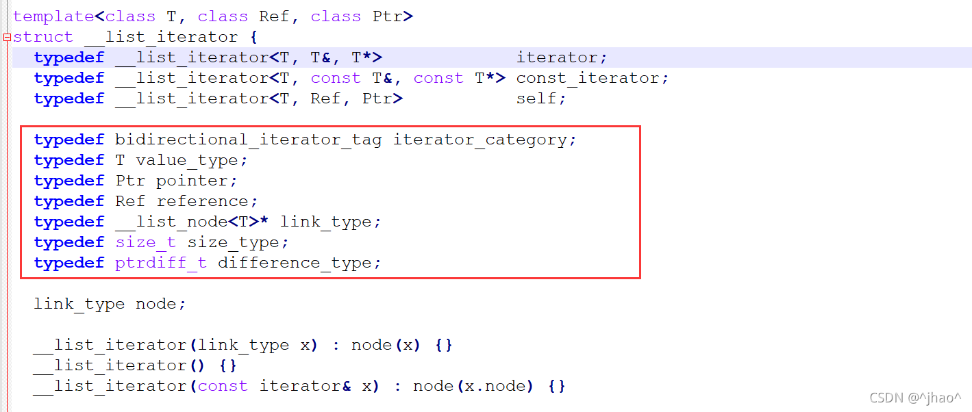 typedef bidirectional_iterator_tag iterator_category; typedef T value_type; typedef Ptr pointer; typedef Ref reference; typedef ptrdiff_t difference_type;
