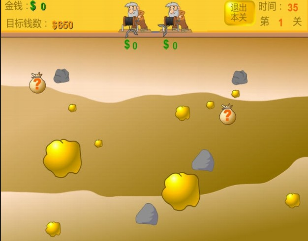 游戏的玩法主要是通过不断采集地下的黄金和钻石,来得到更高的积分。只有完成任务目标,才可以通过相应的关卡。游戏画面中沙滩上的人物便是玩家的角色,下方深褐色的部分是地下,而黄金和钻石就是玩家需要采集的物品。人物右边的四个方框里的物品是游戏中可以使用的道具。 画面中的虚线就是游戏中的探测器,探测器会不断的左右摆动,当摆动到地下的黄金和钻石的位置时,只需要点击矿坑任意处,便可以发射勘探头采集到这些物品,当然一定要瞄准好再出手呦。
