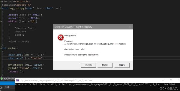 解决方法:使用assert()进行断言,()里面放的是表达式。使用assert需要引用头文件<assert.h>。