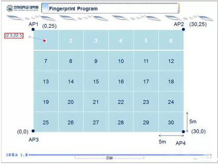 当携带RFID标签收到4个AP的信号值后,根据KWNN算法,对照各个区域的AP信号值,最终测算出自己所在的地理坐标及位置区域。