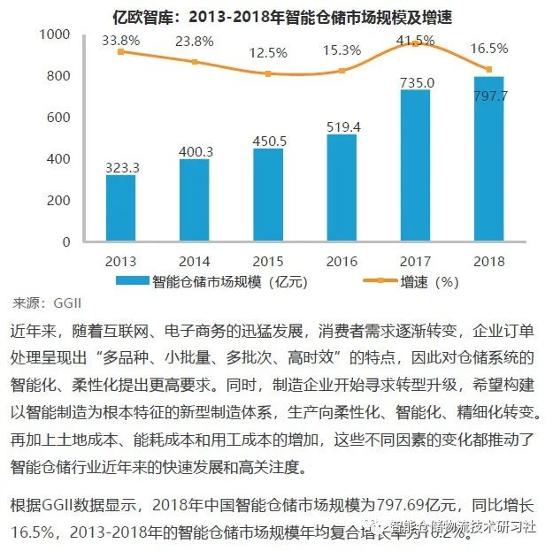 大家好,我是智能仓储物流技术研习社的社长,老K。物流领域受到先进技术深刻影响的同时,也为技术的发展提供良好的环境条件。以智能仓储代表的智能物流科技给物流领域的发展注入了新活力,提升了物流行业的发展效能,推动其实现“跨越式”发展。一起来看一下亿欧智库做的关于智能仓储的行业分析。
