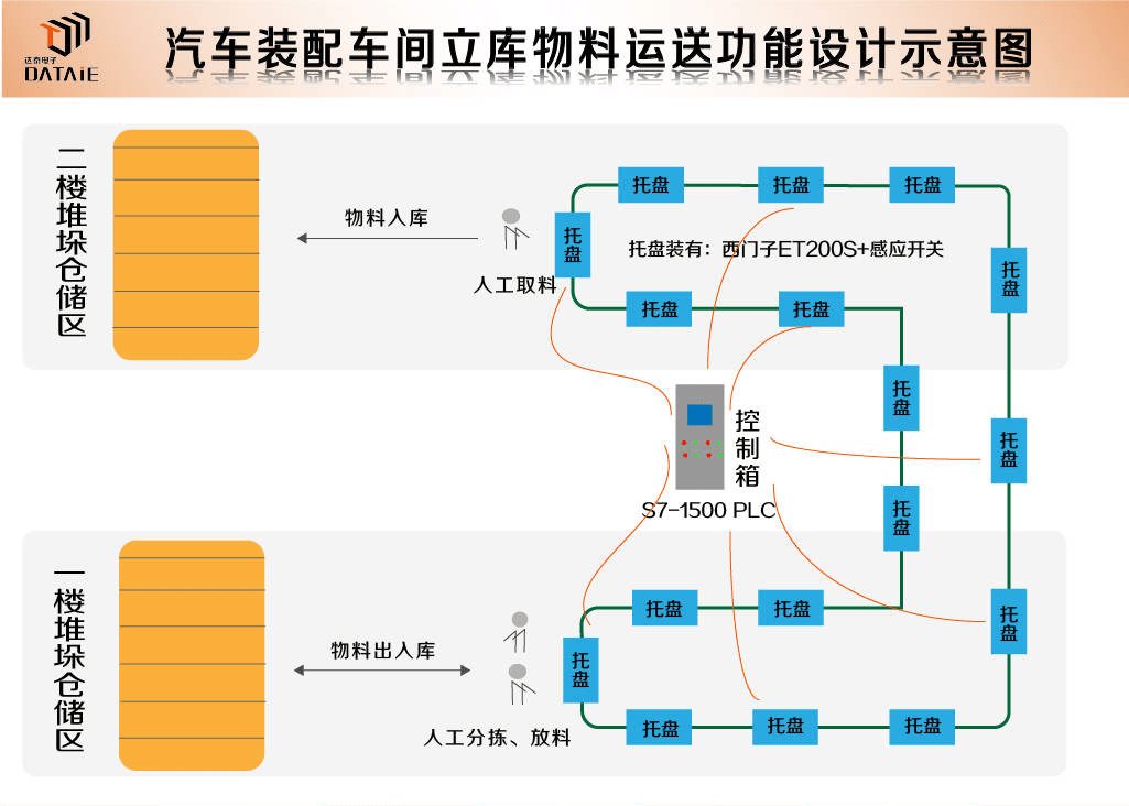 比如,工厂装配车间的立库分为楼上楼下2个生产物流区,通过一条传送带由下往上运送物料,传送带上有17个托盘,每个托盘分别带有识别感应开关,分拣物料由人工来完成。由于传送带运送物料为持续移动装置,不方便布线,因此采用无线方式来实现就地控制柜与传输皮带上17个托盘之间的在线通讯要求,实现物料入库分拣可视化的柔性运输流程,从而提高工厂的物料出入库效率。