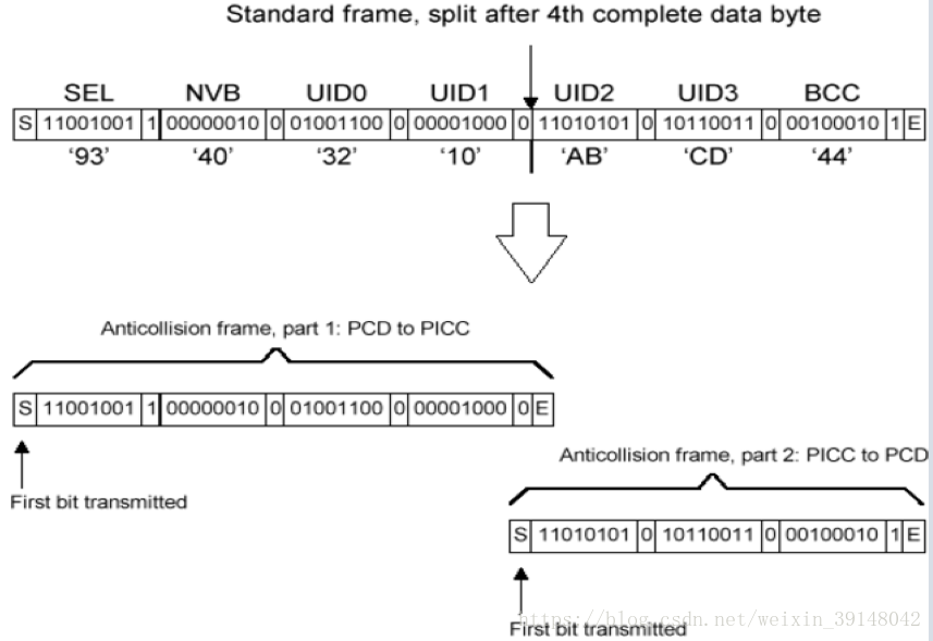 面向比特的防冲突帧(P14):(n个字节,第一个字节规定为SEL,第二个字节规定为NVB,后面的字节为ID)