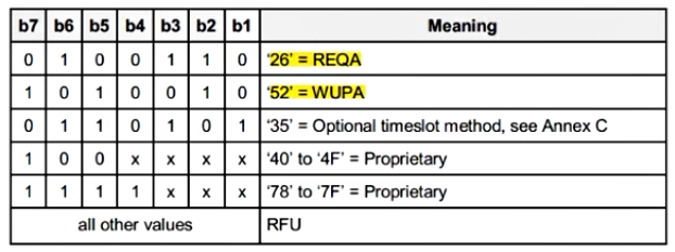标准REQA 的数据内容是 0x26,WAKE-UP 请求的数据内容是 0x52
