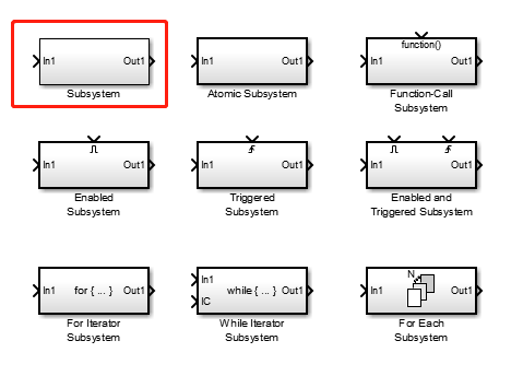 其他的子系统(包括函数调用子系统,使能子系统,触发子系统,迭代子系统等)都是原子子系统,因此默认外框也都是黑粗线。