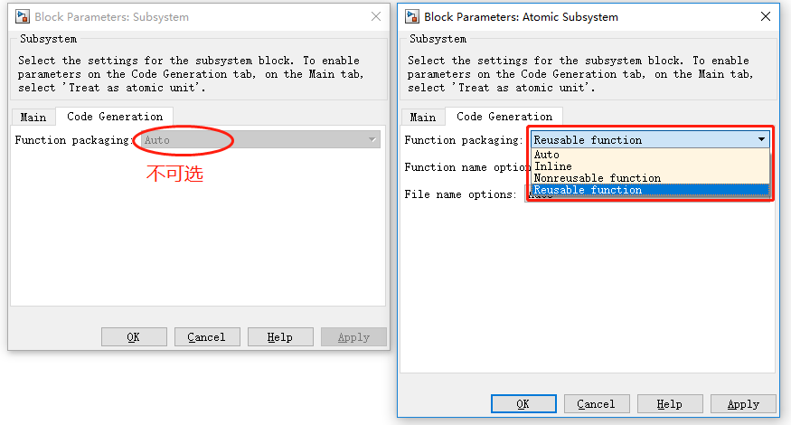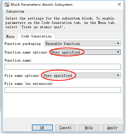 当选择为“Reusable function”或者“Nonreusable function”时,生成的代码可以为子系统的名称,也可以自定义生成的函数名称和文件名称。