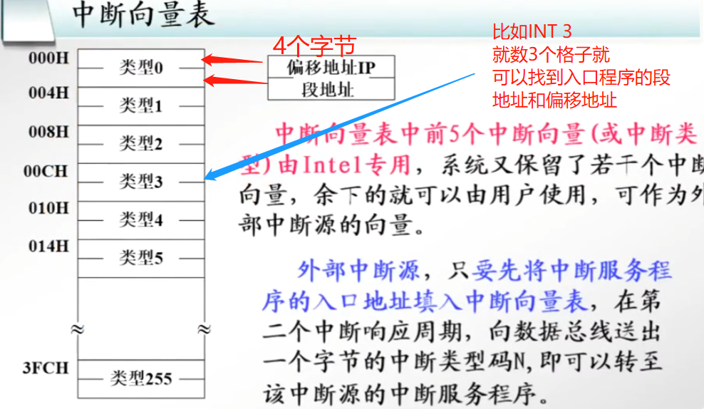 中断向量表(中断子程序入口地址表),在内存的前1K个字节,每个中断占4个字节,前两个字节存放中断子程序入口地址的偏移地址,放入IP,后两个字节存放中断子程序入口地址的段地址,放入CS.已知中断类型码,求中断向量表的位置,乘以4即可。