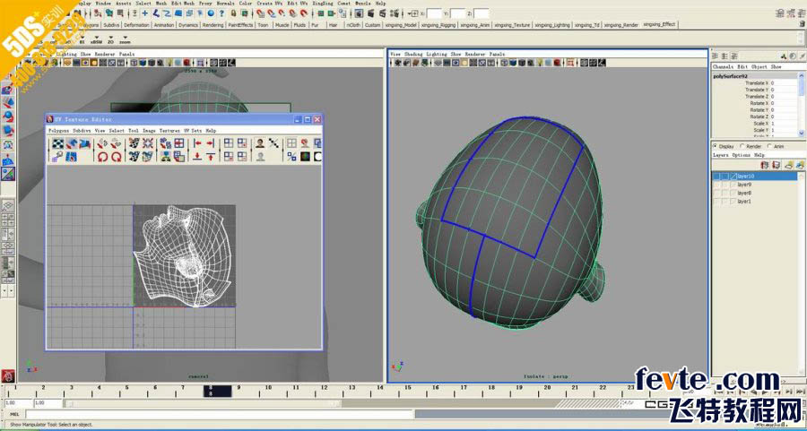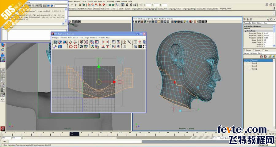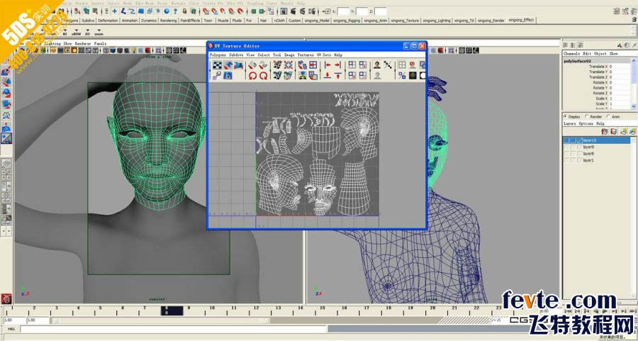 打开MAYA2009 在Window菜单下的Rendering Editors下的Hypershade,材质编辑器,建立一个Blinn材质球,把绘制好的脸部皮肤连接到color层。