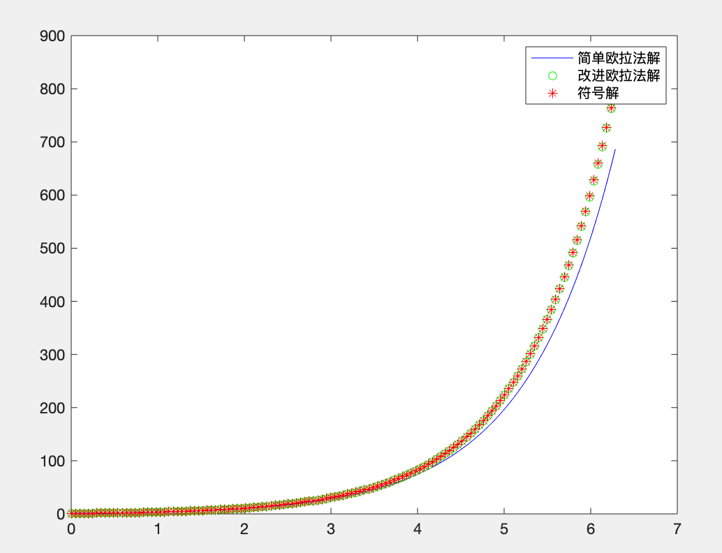 %此处对比改进版欧拉法,简单欧拉法以及微分方程的符号解