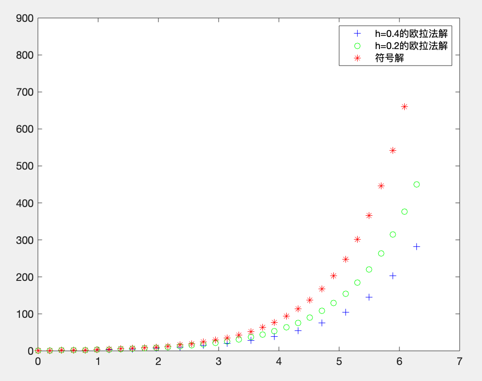 legend('h=0.4的欧拉法解','h=0.2的欧拉法解','符号解');