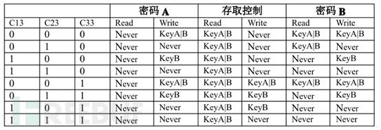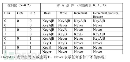 块0,块1,块2控制位均是000,存取控制权限可对应以下表: