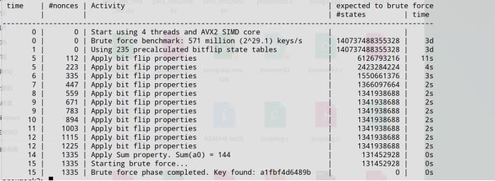 该方法实施的前提是已知某扇区密钥A或密钥B的一种,否则M1卡无法与读卡器完成三轮认证。在默认密钥扫描过程中我们已经得知了除10-15扇区外的所有扇区密钥,此时通过Proxmark3执行“hf mf nested 1 0 A FFFFFFFFFFFF”,使用已获得的0扇区密钥A进行嵌套认证攻击。桂电一卡通使用的M1 4k卡扇区结构与1k卡不同,Proxmark3难以预测到认证过程的随机数,因此无法一步被nested攻击方式破解所有扇区,必须使用单已知密钥对单未知密钥的Hardnested方式。执行“hf mf hardnested 1 0 A FFFFFFFFFFFF 40 A”,即使用已知的0扇区密钥爆破40块所属扇区,结果“a1fbf4d6489b”就是10扇区的密钥A。对其他扇区的爆破也同理,爆破期间会占用大量CPU资源来运算,不同的电脑配置所需时间也不同,一般来说,爆破单扇区未知密钥的时间应在5分钟内,在这期间还未成功就应尝试通过其他方式获取密钥。