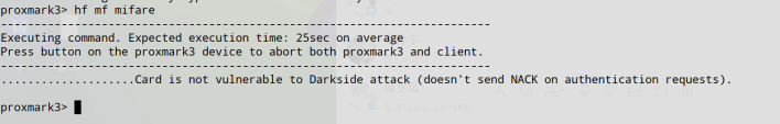 终端执行“hf mf mifare”指令,Darkside攻击结果显示卡片无法使用Darkside攻击,因为其不返回NACK。这说明桂电一卡通使用的M1卡芯片是修复了这一算法缺陷后的版本,其去除了流密钥算法设计中本不该有的反馈机制,此时我们只能通过使用其他方法获取扇区密钥。