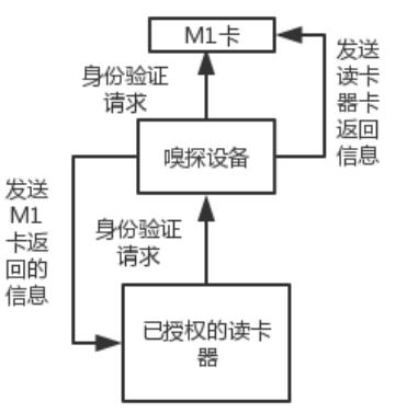 嗅探是破解全扇区加密卡的主要方法,原理是使用硬件对M1卡与已授权的读卡器的交互过程窃听获取数据。如图所示,将嗅探设备方式M1卡和已授权读卡器之间,对M1卡嗅探设备伪装为已授权读卡器,发送身份验证请求,同时对读读卡器伪装为M1卡,发送从M1卡获取的信息,这样嗅探设备便同时与M1卡和已授权的读卡器建立了会话,从而达到窃听交互信息的目的。