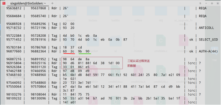 观察“60 2c 9b 90”的前几行数据,标签首先发送“0200”,根据前面的卡类型测试可知这是M1 4k卡的AQTA值,告诉读卡器标签类型,读卡器接收后发送一个“9320”请求标签返回UID值,标签发送4个字节的UID“4d b0 1c eb”及其BCC校验值“0a”,读卡器使用“93 70”命令选择卡片UID,“0b 87”是该指令的CRC校验位,用于卡片判断接收到的命令是否正确。标签核验通过后同意命令,读卡器执行“60 2c 9b 90”,“60 2c”即验证0x2c块的密钥A,“9b 90”为该命令的CRC校验位。此时M1卡与读卡器开始三轮认证,标签发送的“98 64 de 8a”为随机数Nt的明文,“90 d6 81 88 6d 38 1d 00”是读卡器对随机数Nt及Nr加密得到的结果,标签收到加密Nr返回给读卡器。