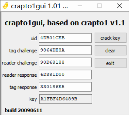 现在我们得到了一卡通与读卡器对2c块进行三轮认证的数据,M1卡在生成密钥时会混合卡片UID计算,因此我们将卡片UID和三轮认证过程的数据对应填入Crypto-1逆向工具箱中运算。因为认证成功的2c块属于10扇区,这样我们就得到了10扇区的密钥A“A1FBF4D6489B”。
