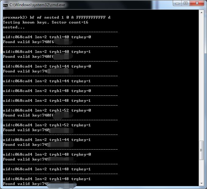 有意思是,Proxmark的字典里自带的这12种密码,包含了世界范围内发行的RFID卡片默认出厂钥匙,而国内的卡片出厂一般都是“ffffffffffff”