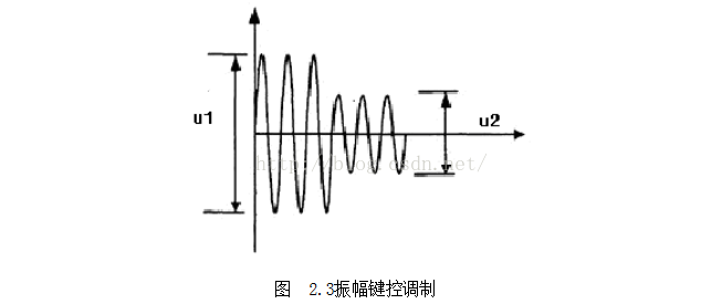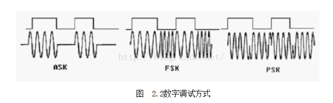 标签与询问器之间通过电感性耦合进行通信,当询问器以标准指令的形式访问标签时载波需加载一个4K位/秒曼彻斯特编码数据信号; 调制采用ASK调制,调制指数100%; 在实际通信系统中,很多系统都不能直接传送基带信号,必须用基带信号对载波波形的某些参量进行控制,是载波的这些参量随基带信号的变化而变化。由于正弦信号形式简单, 便于产生和接收,大多数数字通信系统中都采用正弦信号作为载波,即正弦波调制。数字调制技术是用载波信号的某些离散状态来表示所传送的信息,在接收端也只要对载波信号的离散调制参量进行检测。数字调制方式,一般有振幅键控(ASK)、移频键控(FSK)和移相键控(PSK)三种基本调制方式,如图2.2所示: