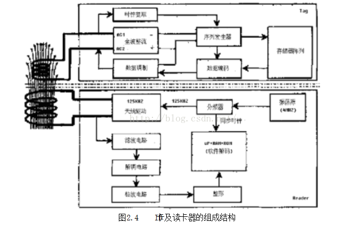 图2.4是ID卡及其读卡器的工作原理框图,其中上半部分是ID卡的内部组成结构;下半部分是ID读卡器的组成结构。