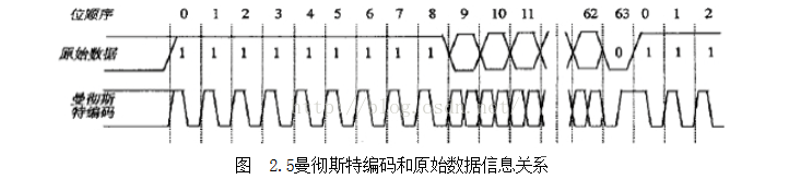 ID卡内部的曼彻斯特编码和原始数据信息关系见图2.5。曼彻斯特编码采用下降沿表示‘1’采用上升沿表示‘0’。读卡器的微控制器软件的主要功能就是对从ID卡接收到的曼彻斯特编码进行解码,得到ID卡内部的64位数据信息,然后进行CRC校验,如果校验成功,那么就完成了一次读卡过程。