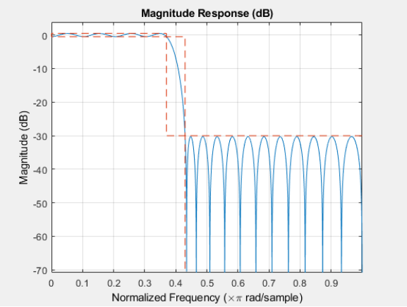 设计最小阶低通 FIR 滤波器,其通带频率为 0.37*pi 弧度/采样点,阻带频率为 0.43*pi 弧度/采样点(因此过渡带宽度等于 0.06*pi 弧度/采样点),通带波纹为 1 dB,阻带衰减为 30 dB。
