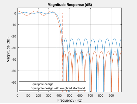 legend(hfvt,'Equiripple design', 'Equiripple design with weighted stopband')