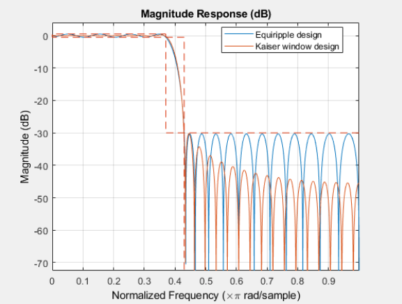 legend(hfvt,'Equiripple design', 'Kaiser window design')